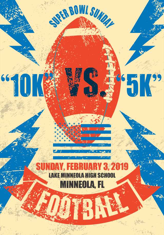 Kick off your Super Bowl Sunday with a beautiful out and back run along the undeveloped, newly constructed portion of Hancock Road in Minneola. Wear your favorite team jersey, be your own cheerleader, or better yet, a team themed costume to be eligible for craziest fan costume prizes. The race starts and finishes on the Lake Minneola High School Track. Feel "guilt free" after your run, when you know you are about to enjoy tailgating food while enjoying the biggest football game of the year!